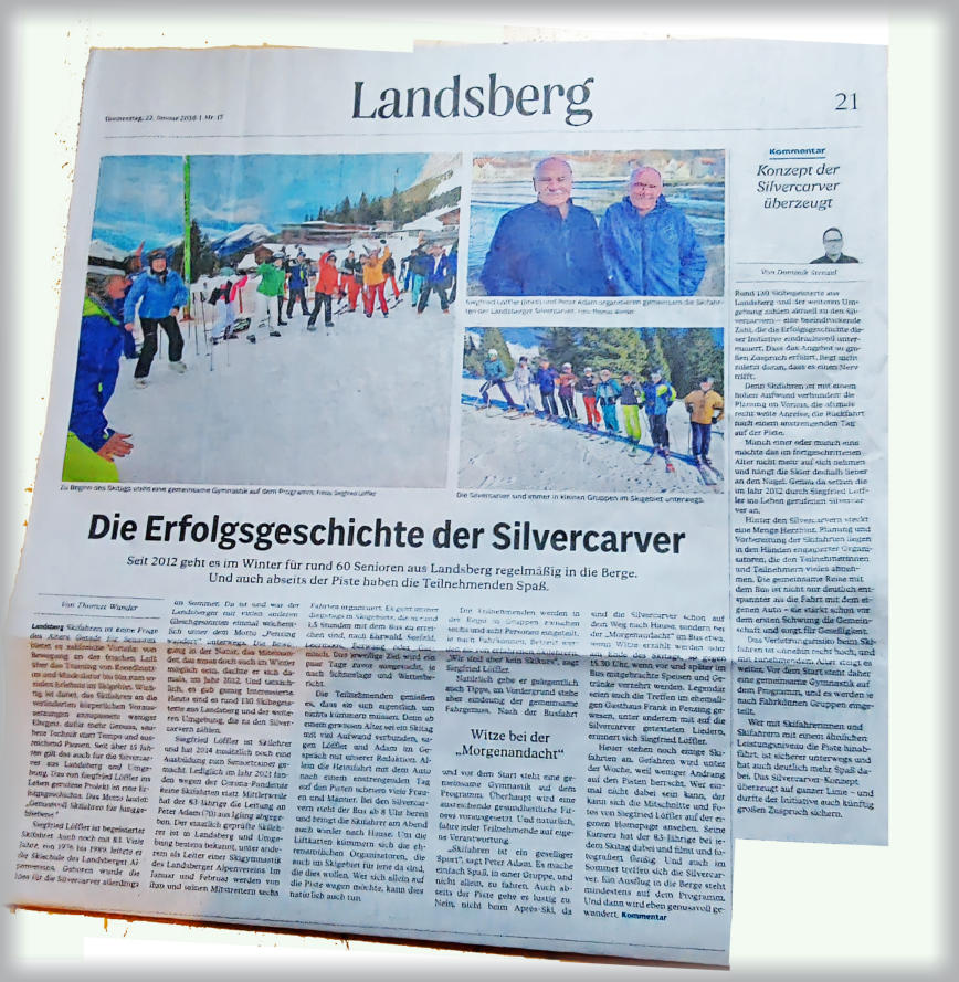 Seit 2012 ist die von Sigi Löffler ins Leben gerufene Institution der Silvercarver ein Markenzeichen für genussvolles Skifahren mit jung gebliebenen Senioren/innen. Weit über Landsbergs Grenzen hinaus lockt der gute Ruf gleichgesinnte Skibegeisterte im Januar und Februar an sechs Dienstagen in die winterliche Bergwelt und auf die Pisten von Ehrwald, Lermoos, Berwang, etc.. In von erfahrenen und einfühlsamen Skilehrern/innen betreuten Gruppen von sechs bis acht Teilnehmern/innen kann sich jede/r auf den wochentags wenig frequentierten Pisten auf ein optimales Skivergnügen freuen. Sofern gewünscht, unterstützen die Begleiter/innen gerne mit Tipps und Empfehlungen für ein freudvolles Skifahren.